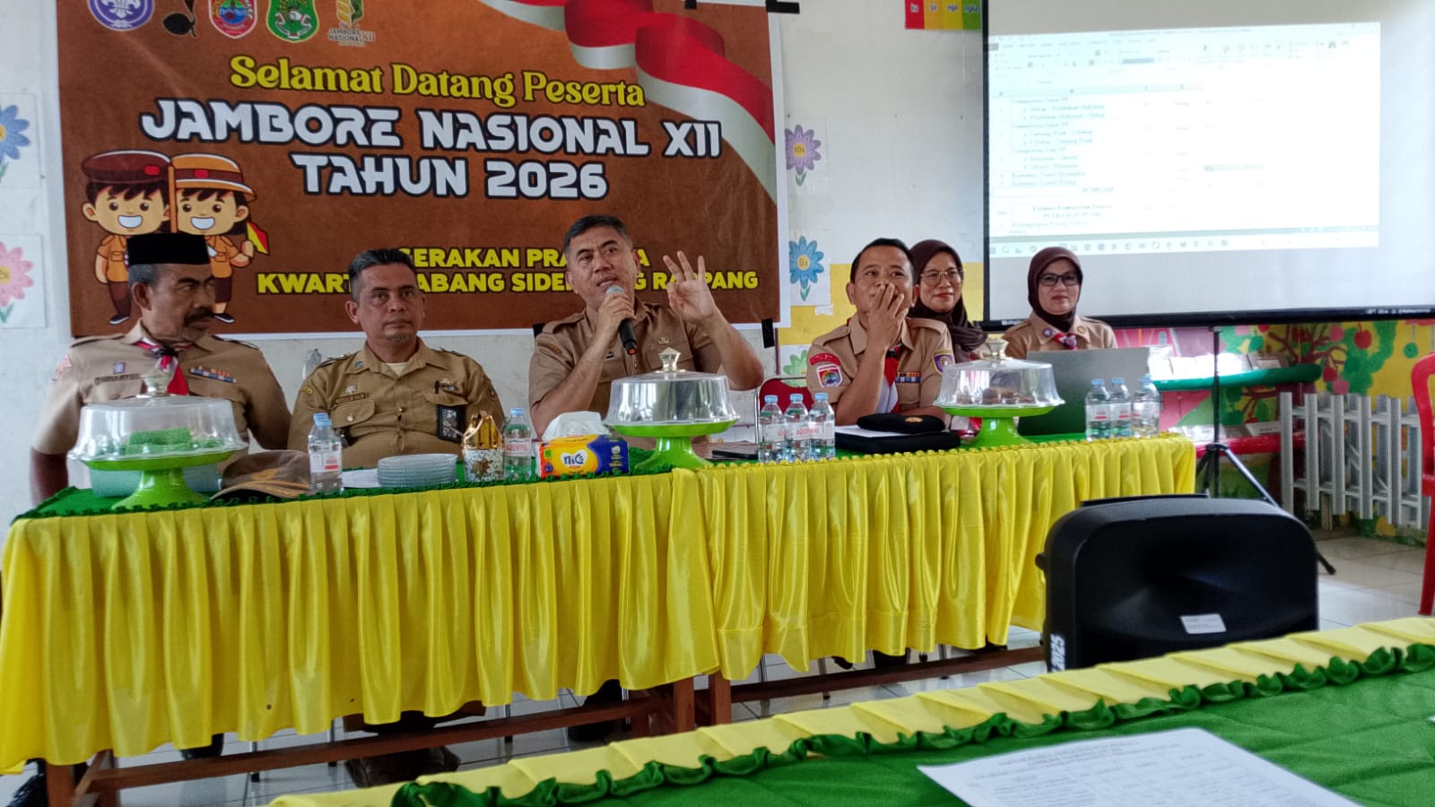 AJATAPPARENG.ONLINE, SIDRAP — Kwartir Cabang (Kwarcab) Gerakan Pramuka Sidenreng Rappang (Sidrap) menggelar Rapat Koordinasi Teknis Pembekalan Jambore Nasional (Jamnas) XII pada Senin (20/4/2026). Pertemuan yang berlangsung di Aula SD 2 Pangkajene ini bertujuan untuk memantapkan skema pembekalan bagi para calon peserta kontingen asal Bumi Nene Mallomo.