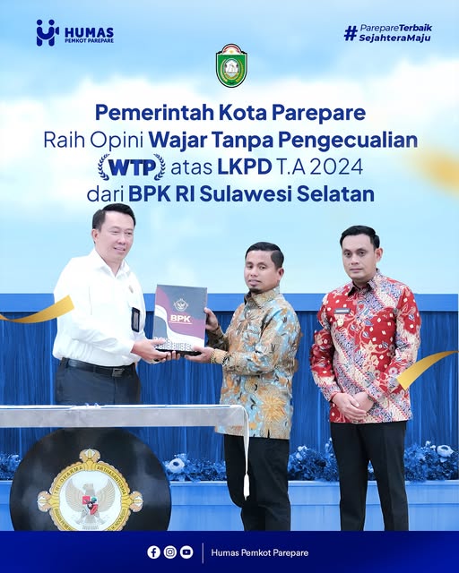 Untuk kesekian kalinya, Pemkot Parepare berhasil meraih Opini Wajar Tanpa Pengecualian (WTP) atas Laporan Keuangan Pemerintah Daerah (LKPD) Tahun Anggaran 2024.